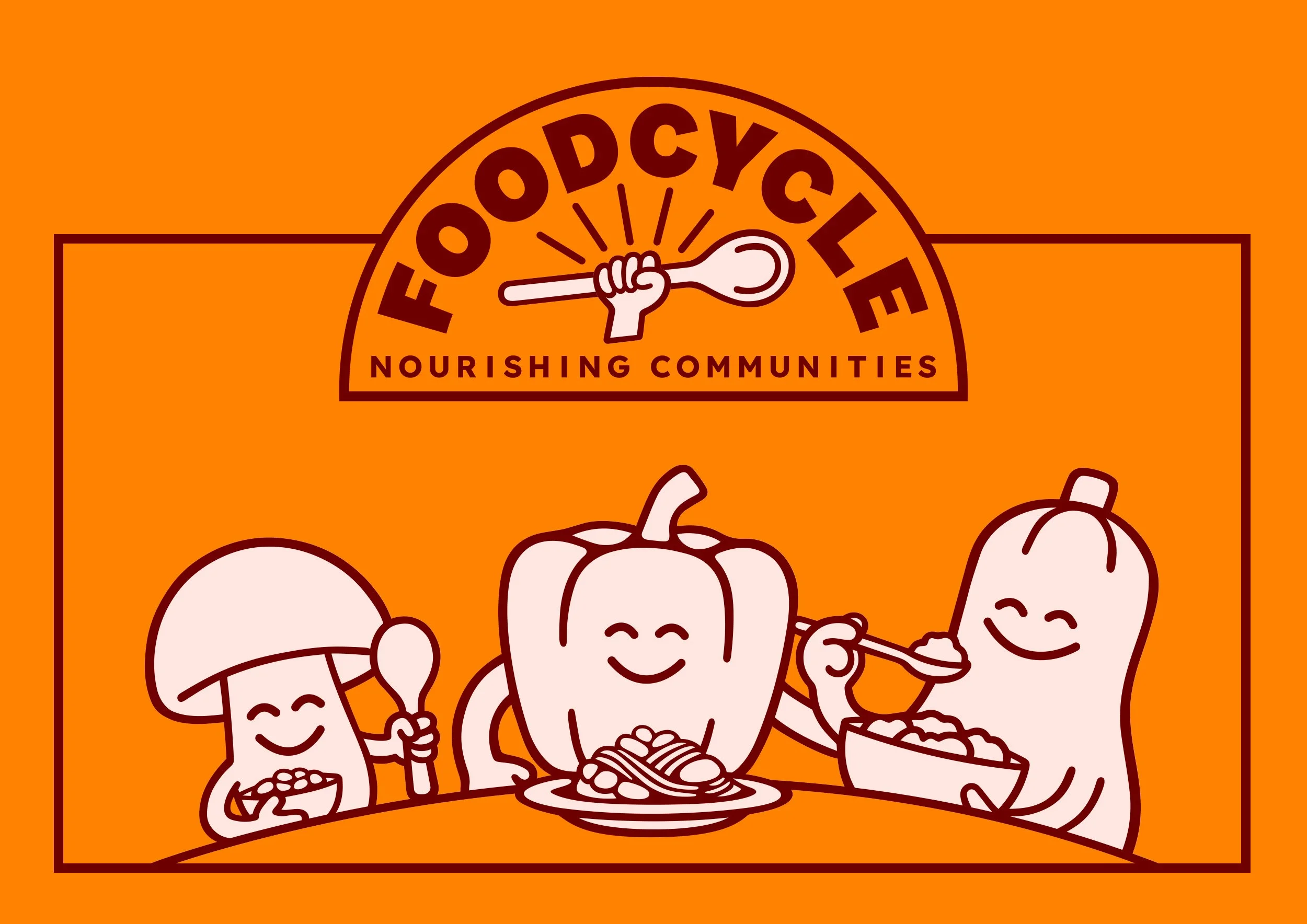 Once this was completed, Food Cycle were fortunate to receive pro bono design support from the agency Tucker Duckworth, who updated the identity to match the new brand personality. They even created a series of cheerful characters to convey the warmth and positivity you get from FoodCycle community meals.